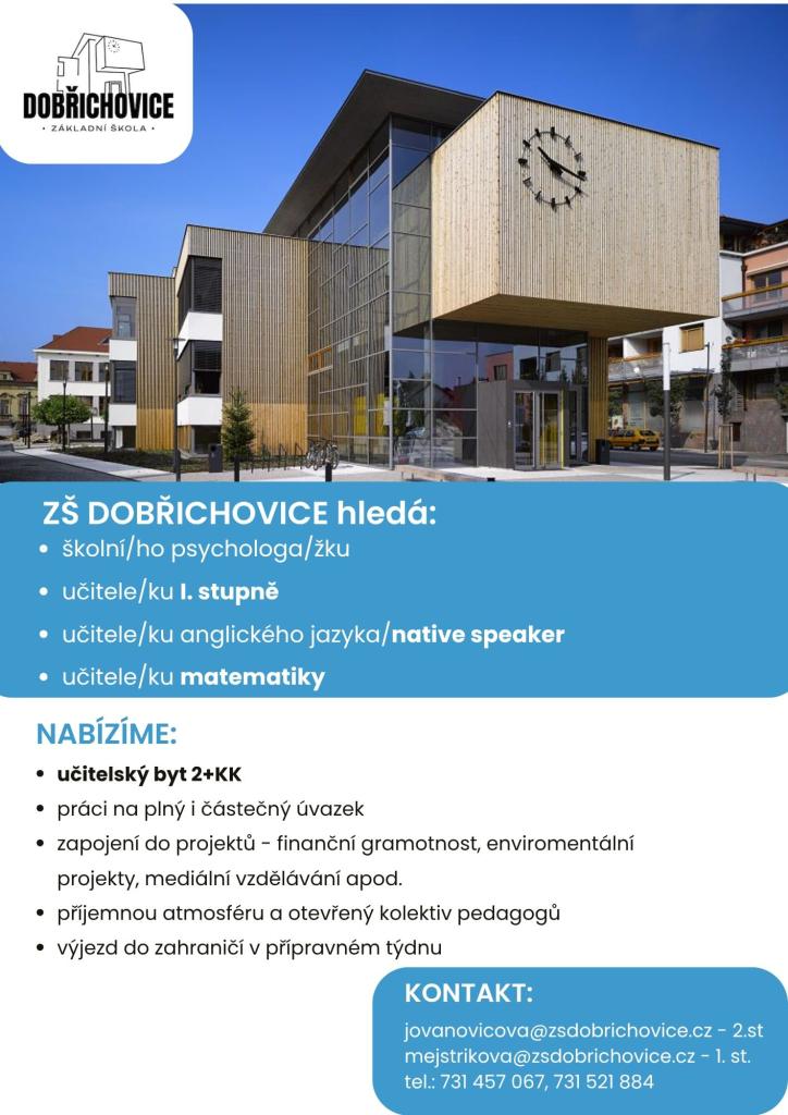 kontakt: jovanovicova@zsdobrichovice.cz 2. stupeň mejstrikova@zsdobrichovice.cz 1. stupeň tel.: 731 457 067, 731 521 884.