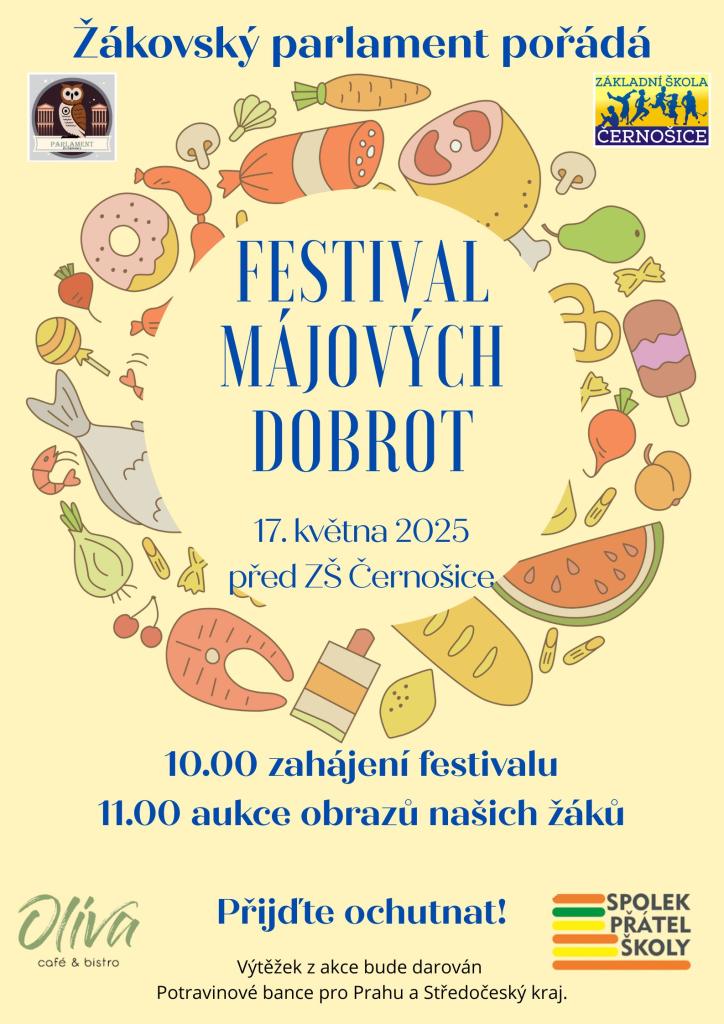 V 10:00 zahájení, v 11:00 aukce obrazů žáků ZŠ Černošice. Výtěžek bude darován Potravinové bance pro Prahu a Středočeský kraj. Festival pořádá Žákovský parlament.