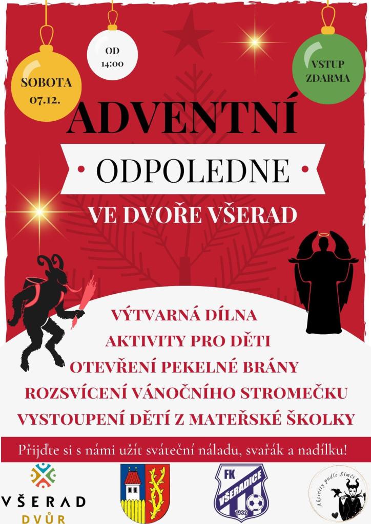 Zveme vás na adventní odpoledne pro celou rodinu, které se koná v sobotu 7. prosince od 14:00. Těšit se můžete na dílničky, aktivity pro děti, rozsvícení vánočního stromečku a spoustu zábavy!